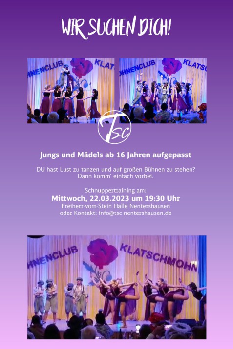 Am 19.03.2023 präsentieren unsere Gruppen ihre aktuellen Tänze im Bürgerhaus in Nentershausen.